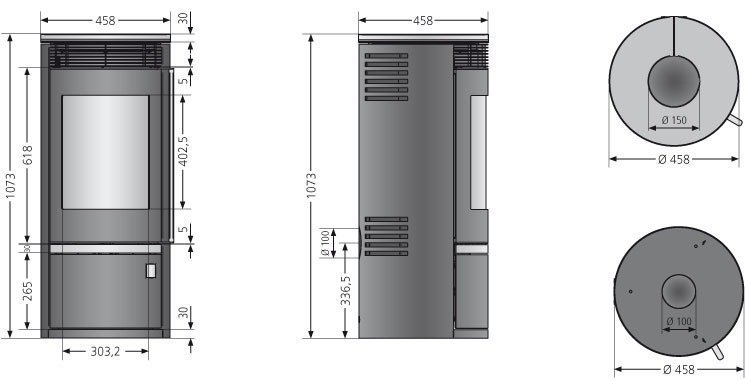 Rauchrohranschluss: Ø 150 mm (oben), Höhe: 1060 mm